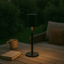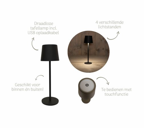 - Draadloze tafellamp LED zwart metaal - dimbaar - 3 verschillende lichtstanden - incl. USB oplaadkabel - hoogte: 27,5cm - diameter: 9cm - geschikt voor binnen en buiten IP44 spatwaterdicht.