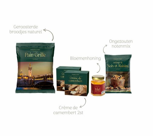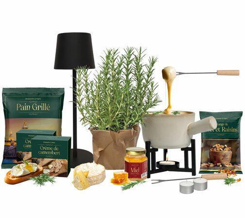 Dit kerstpakket bevat daarnaast luxe producten uit de Brasserie à Paris lijn om te genieten op z'n Frans: romige crème de camembert, knapperige geroosterde broodjes, geurige bloemenhoning en een verfijnde noten-rozijnenmix. Met deze ingrediënten en het bijgevoegde recept zet je in een handomdraai een onweerstaanbare fonduedip op tafel. Alles voor een knusse, culinaire ervaring aan eigen eettafel. Een kerstcadeau voor een avond vol gezelligheid, smaak en Franse sfeer. Bovendien geef je jouw medewerkers of relaties een blijvende herinnering. Terwijl de rozemarijnplant groeit en bloeit, blijft de ontvanger herinnerd aan de waardering en het warme gebaar achter dit geschenk.